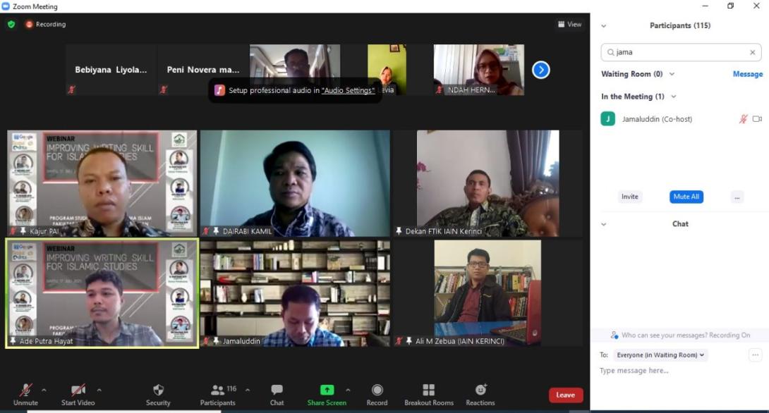 SUNGAIPENUH- Program Studi (Prodi) Pendidikan Agama Islam (PAI) IAIN Kerinci sukses menggelar seminar online penulisan karya ilmiah dengan tema Improving Writing Skill For Islamic Studies, Sabtu (17/7/2021).