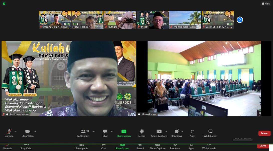Sungai Penuh - Optimalisasi minat wakaf di kalangan pelaku ekonomi kreatif di Indonesia menjadi isu penting yang dibahas dalam Kuliah Umum Fakultas Syariah Institut Agama Islam Negeri (IAIN) Kerinci dalam mengawali semester ganjil tahun ajaran 2023/2024, di gedung auditorium Kampus I IAIN Kerinci, Rabu (13/09/2023).