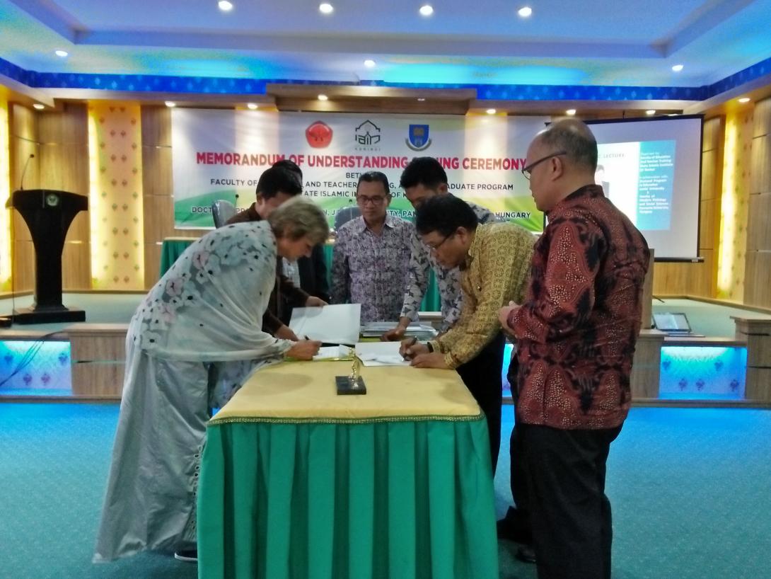 Penandatanganan MoU dilakukan oleh Dekan FTIK, Dr. Dairabi Kamil, M.Ed dan Direktur Propram Pascasarjana, Dr. Ahmad Jamin, M.Ag. Sedangkan dari Universitas Jambi dan Universitas Pannonia Hungaria diwakili oleh Ketua Program Studi Kependidikan Pascasarjana, Amirul Mukminin, P.hD dan Dekan Faculty of Modern Philology and Sosial Sciences, Prof. Dr. Judit Navracsics. Acara yang berlangsung di ruang pertemuan kampus utama IAIN Kerinci ini disaksikan Wakil Rektor I, Drs. Bahrum, M.Ag.